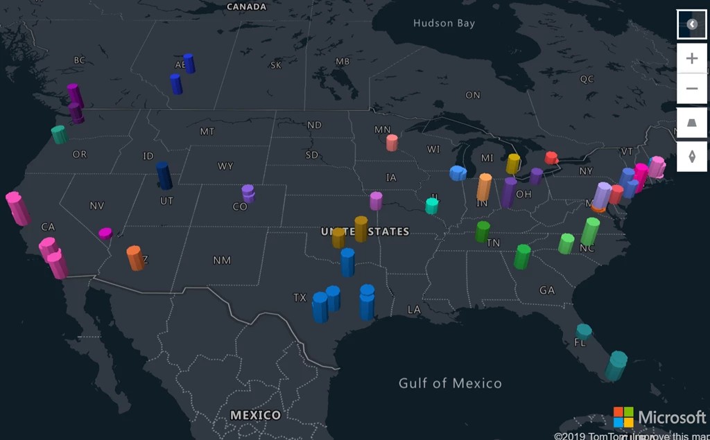 The image above is a stock image – but it highlights the highly visual new dashboard widgets (we can’t put screen captures the client we did this for – they had the bubbles centered on city centers). We had a list of business categories, internal region slicers and time frames so that the end user could quickly see what other companies were NOT in a region. The end goal was to see what regions they could focus on for future work.